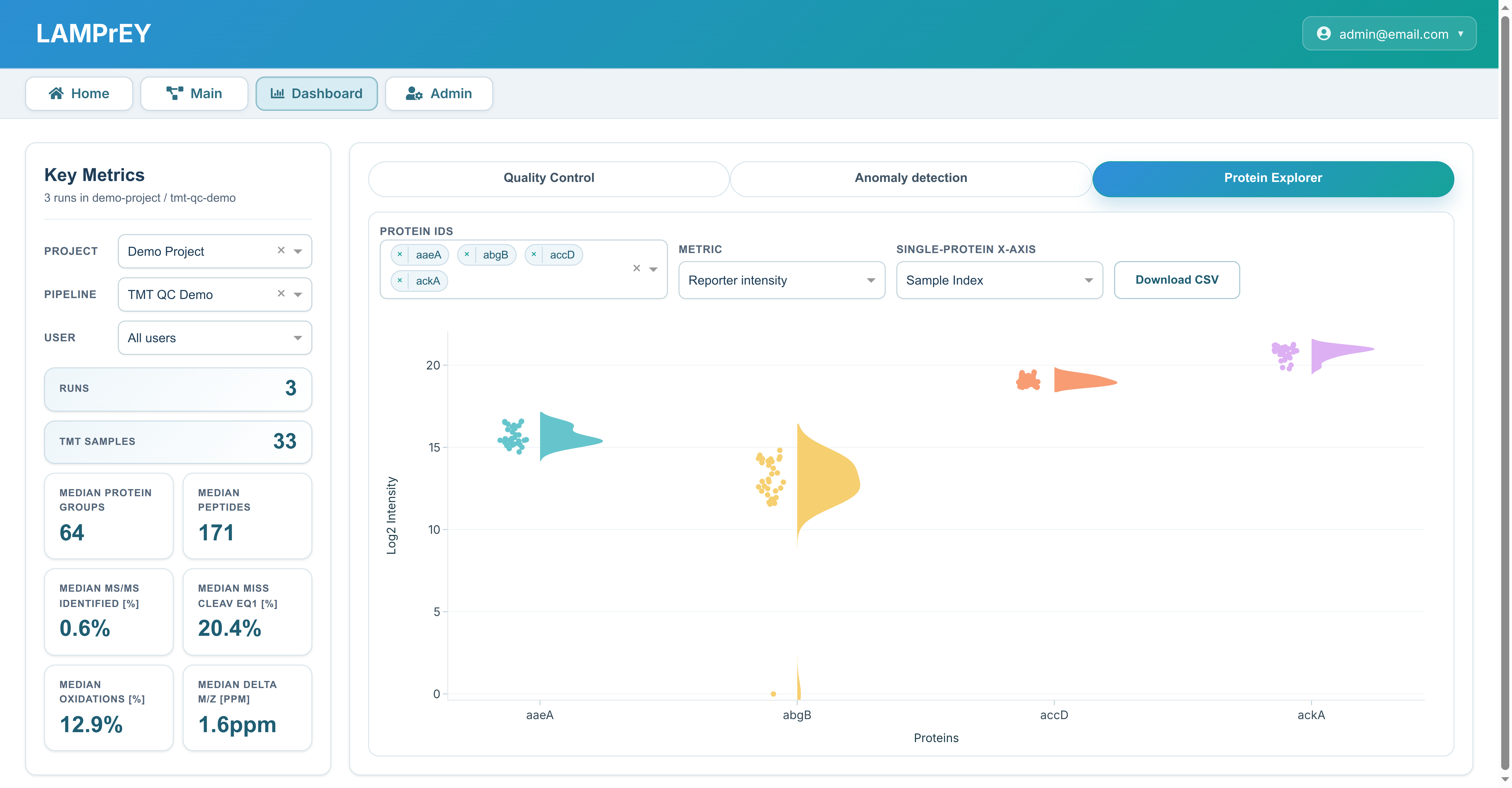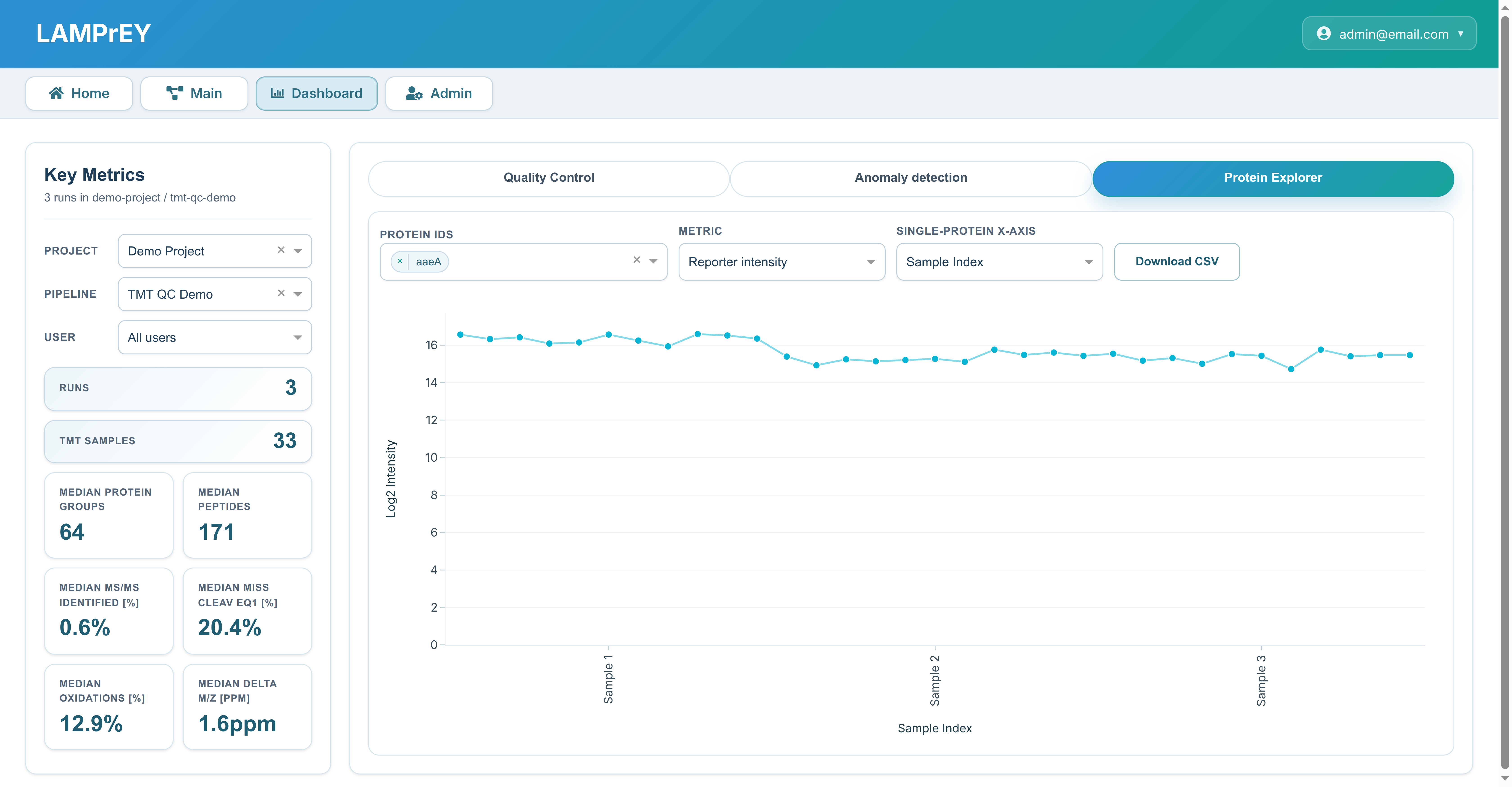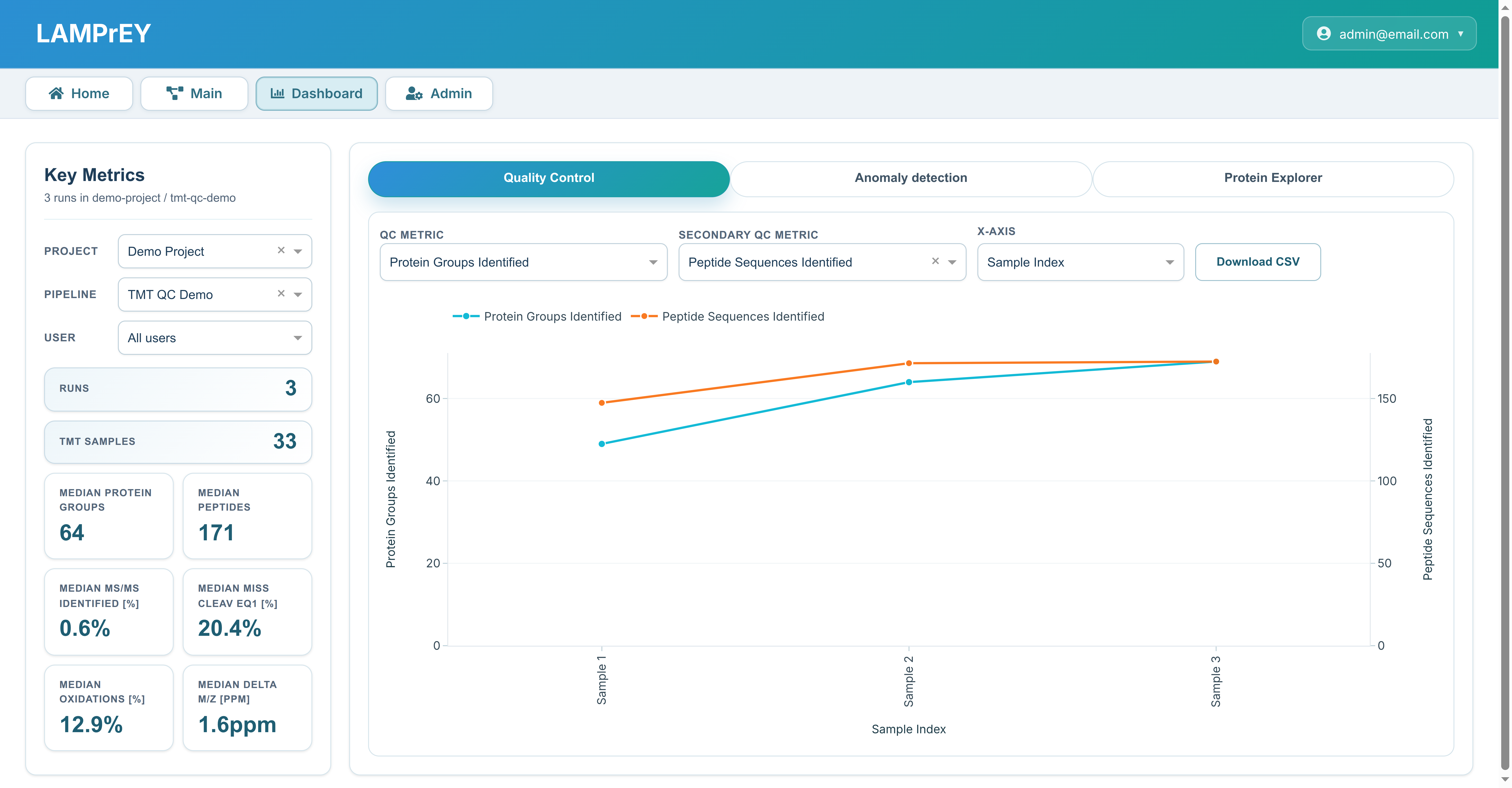 Users can choose the primary QC metric, optionally add a secondary metric on a second y-axis, and switch the x-axis between run index, sample name, and acquisition date depending on the comparison they want to make. The tab also includes a CSV export so the currently scoped QC data can be downloaded for further analysis outside the application.