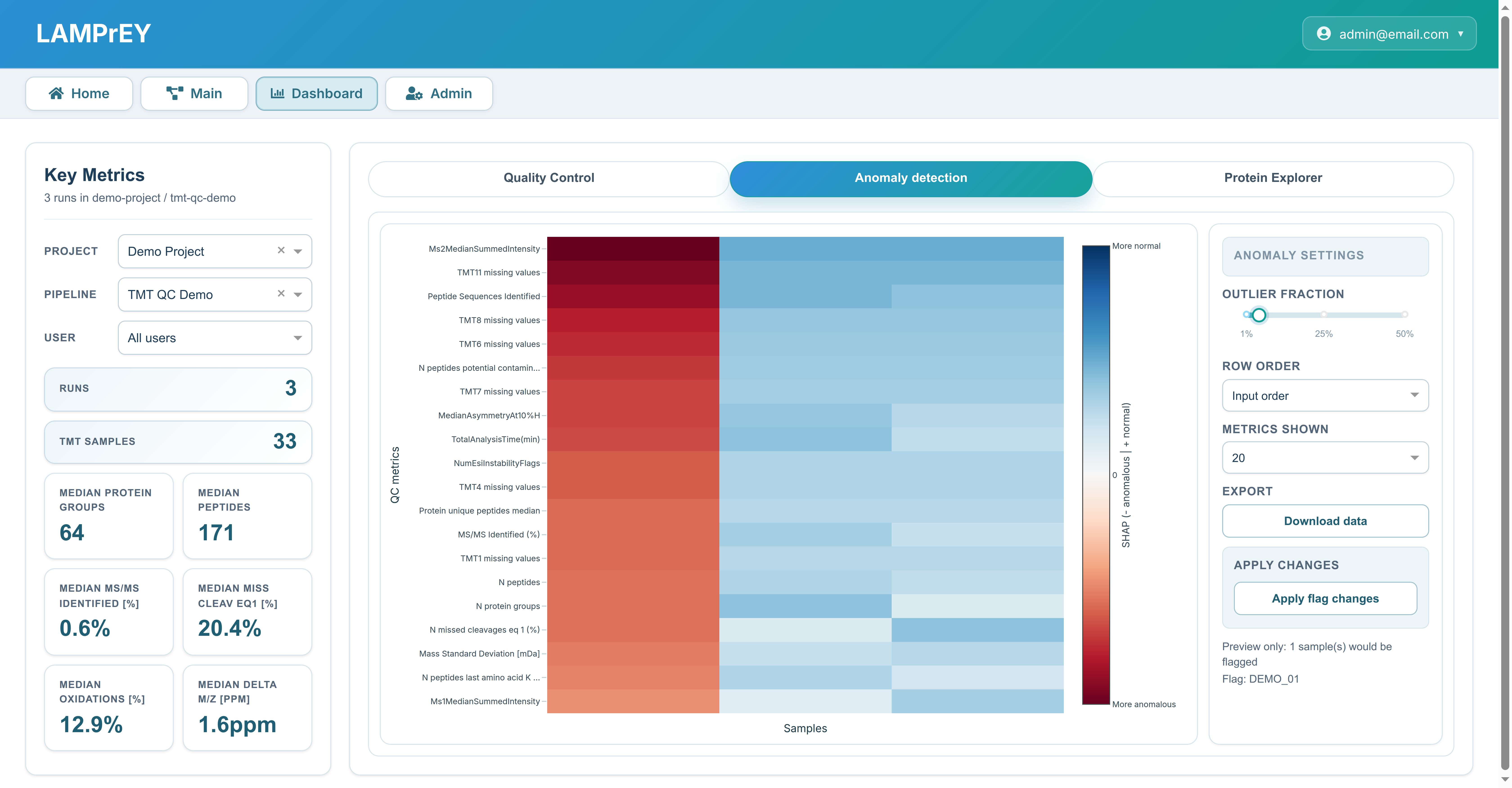 This tab lets users control the anomaly workflow by selecting the expected outlier fraction (5% default). The resulting view combines anomaly scores, a heatmap of metric-level contributions, and SHAP-based explanations to show which features drove each flagged run. Users can also download the anomaly table and apply the proposed flagging changes back to the pipeline. At a high level, the algorithm looks for runs that deviate from the overall multivariate QC pattern rather than from a single metric alone.