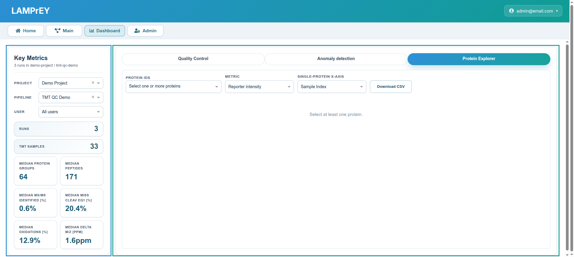 - The right panel includes the working area with three tabs: QC Plots, Anomaly detection, and Protein explorer.
