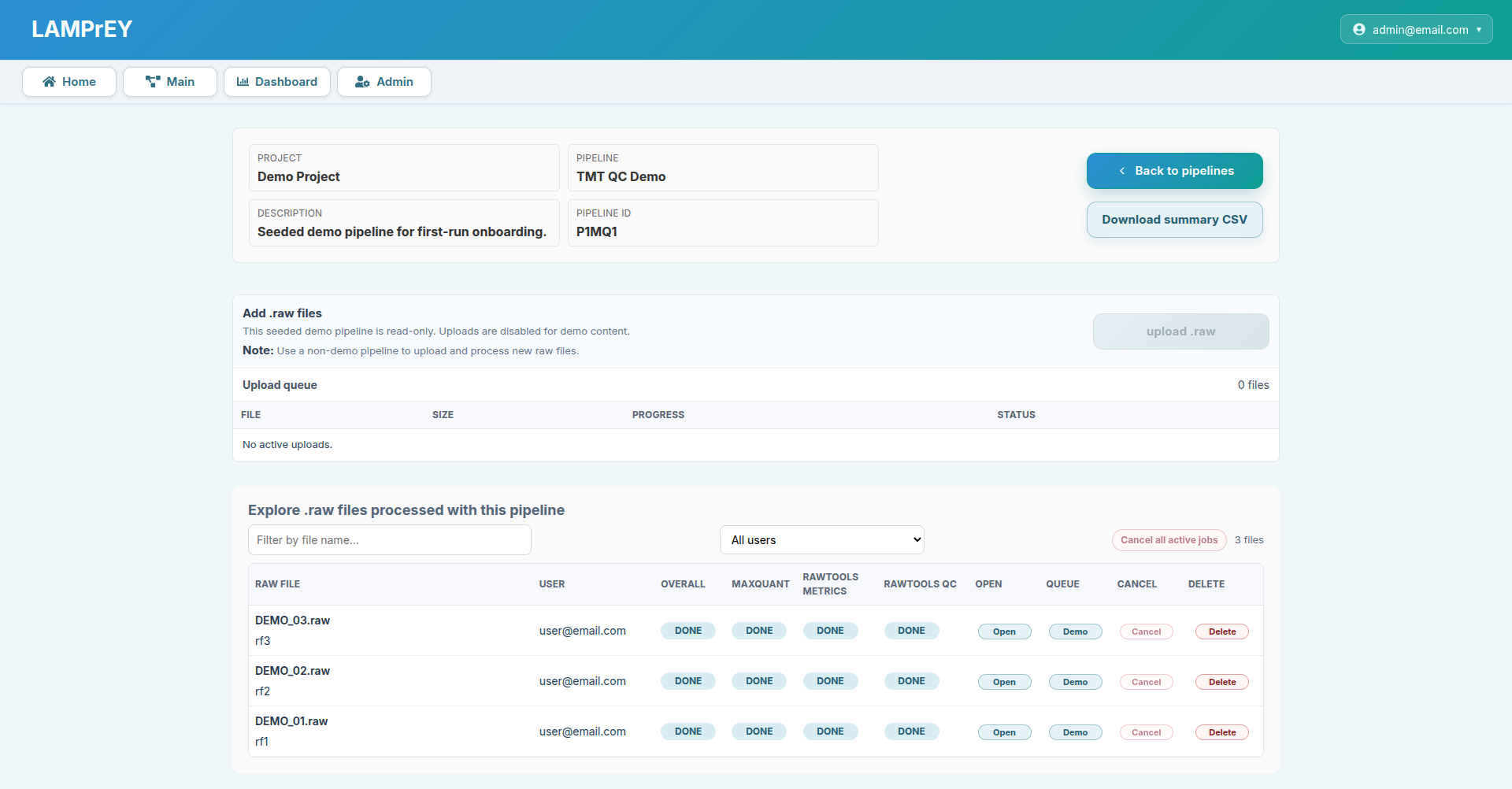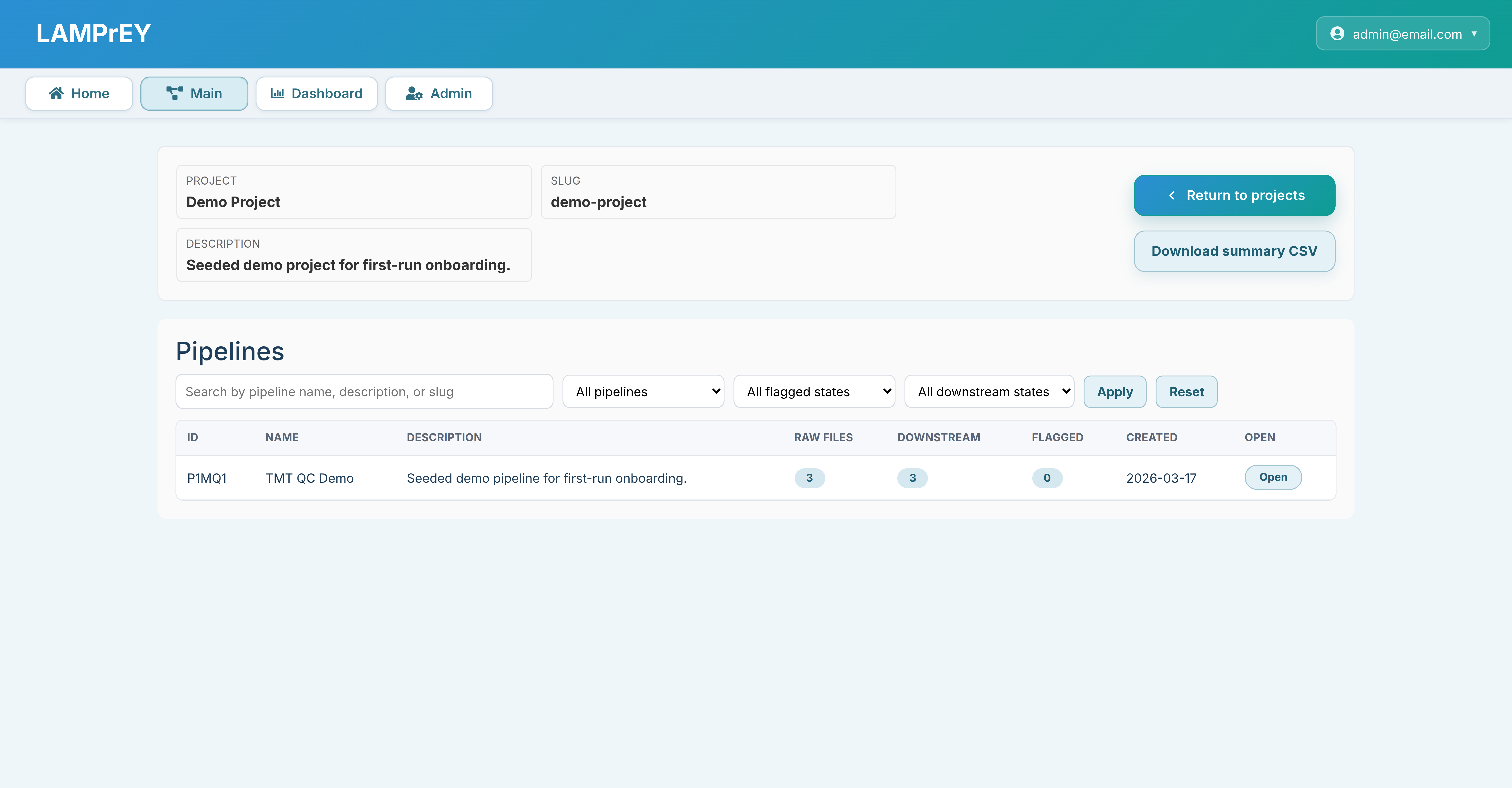 Inside the demo project, open the TMT QC Demo pipeline to see the seeded runs and the standard pipeline workflow.