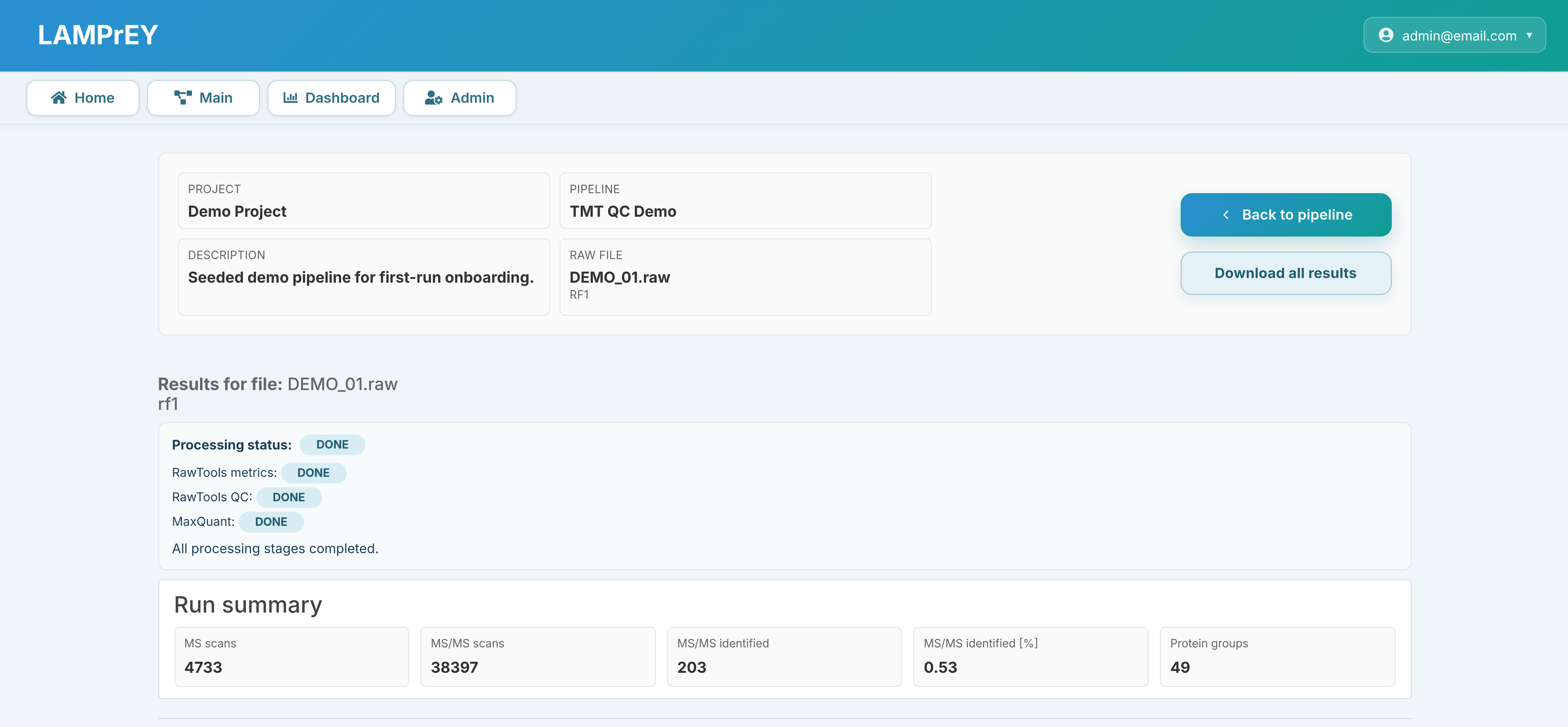 config/: demomqpar.xmlandfasta.faaruns/demo_01..demo_03/maxquant/: minimal MaxQuant outputsruns/demo_01..demo_03/rawtools/: RawTools metrics and chromatogramsruns/demo_01..demo_03/rawtools_qc/: RawTools QC outputsmanifest.json: the ordered list of seeded demo runs and displayed raw-file names