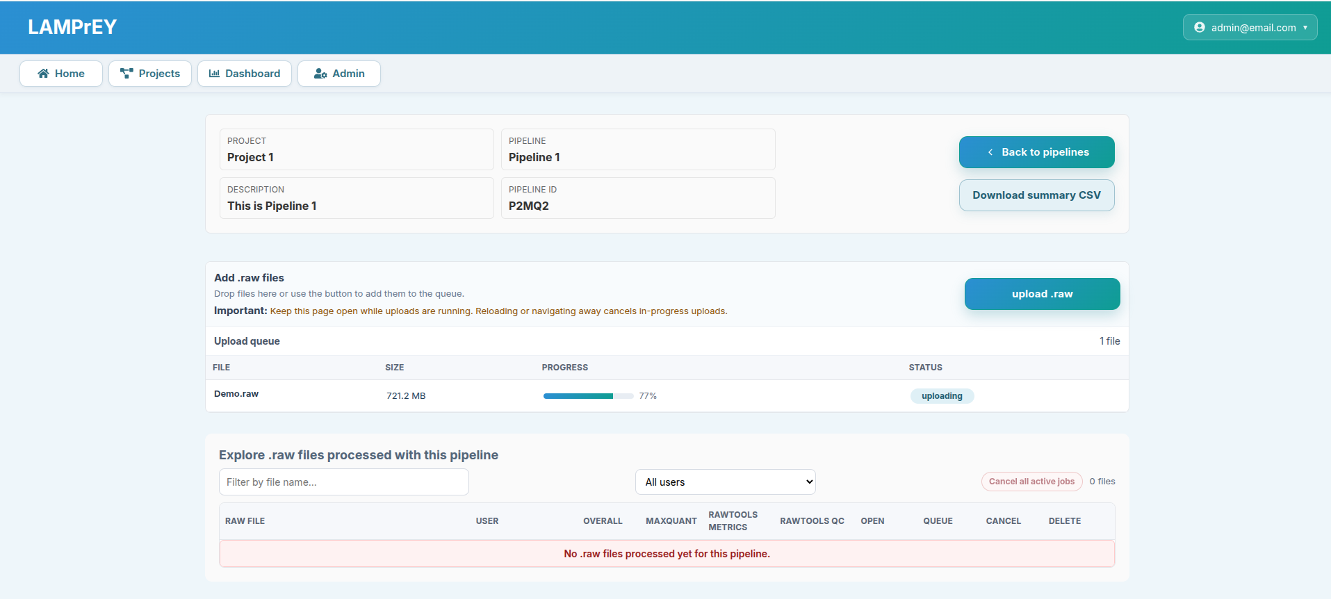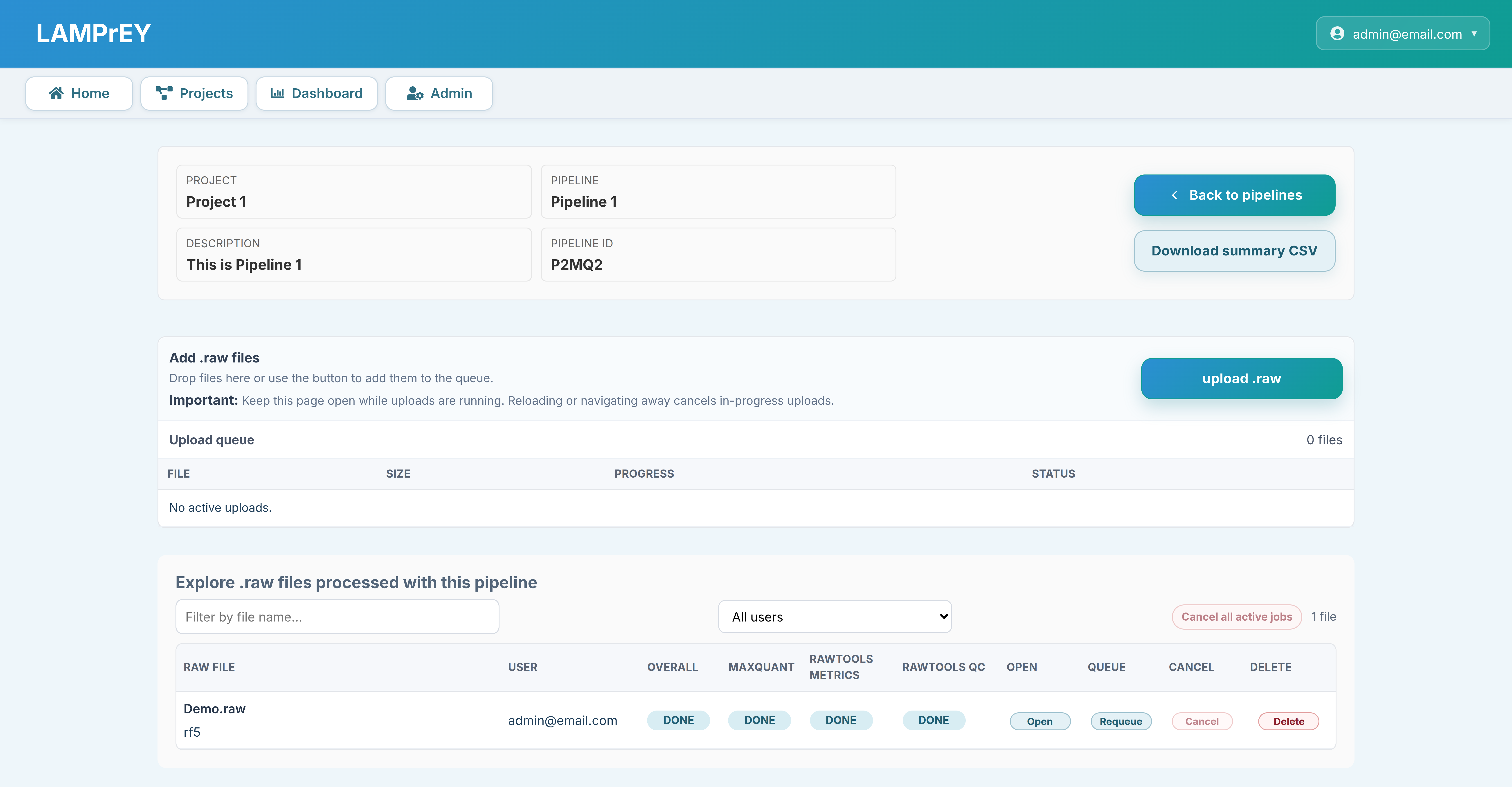 - after upload, the pipeline page shows a run table with overall status plus separate MaxQuant, RawTools metrics, and RawTools QC statuses