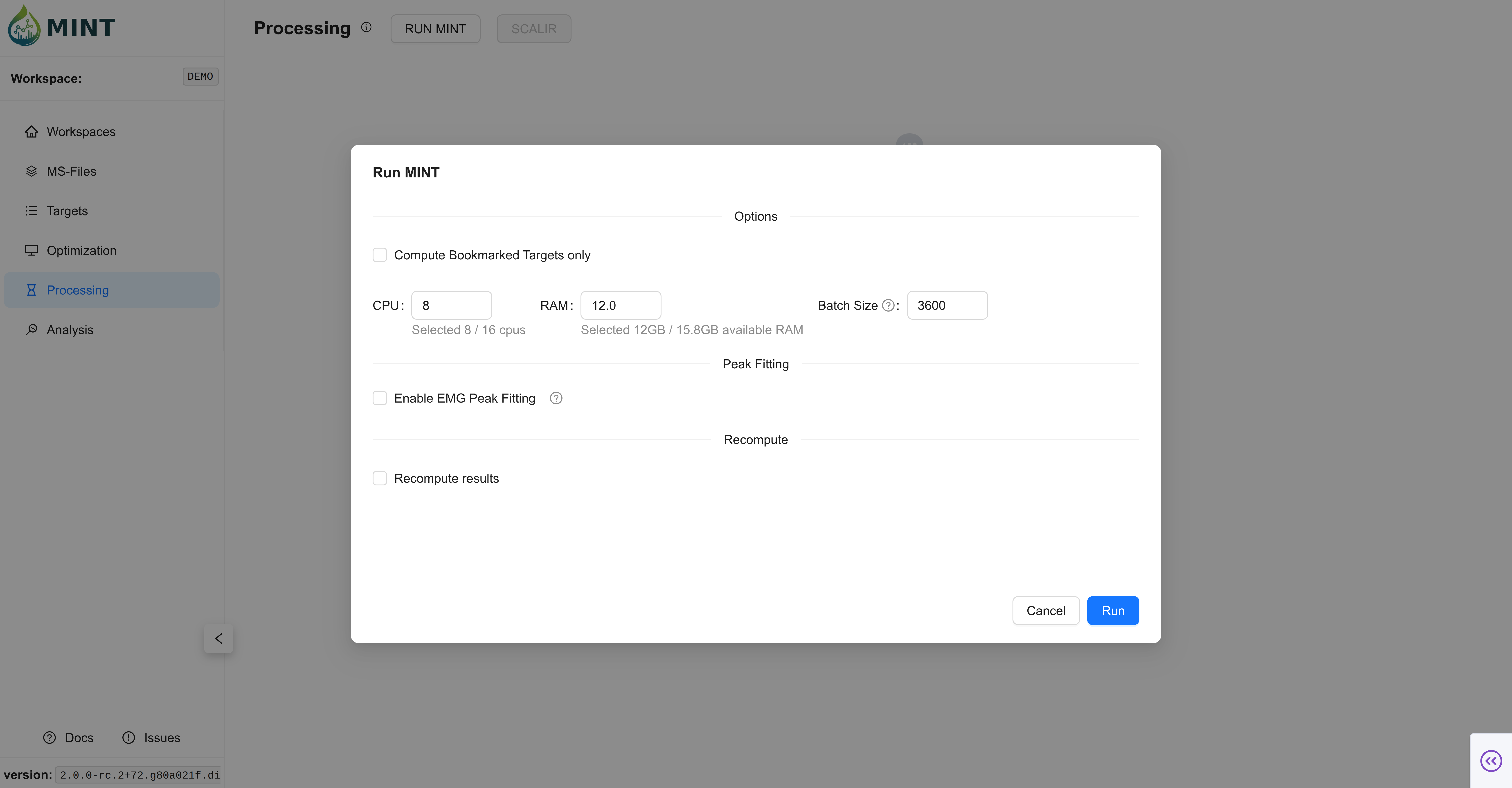 RUN MINT. Choose bookmarked-only mode, recompute/fitting, and compute resources. - Run Extraction: MINT computes chromatograms, then results, then optional EMG fitting.