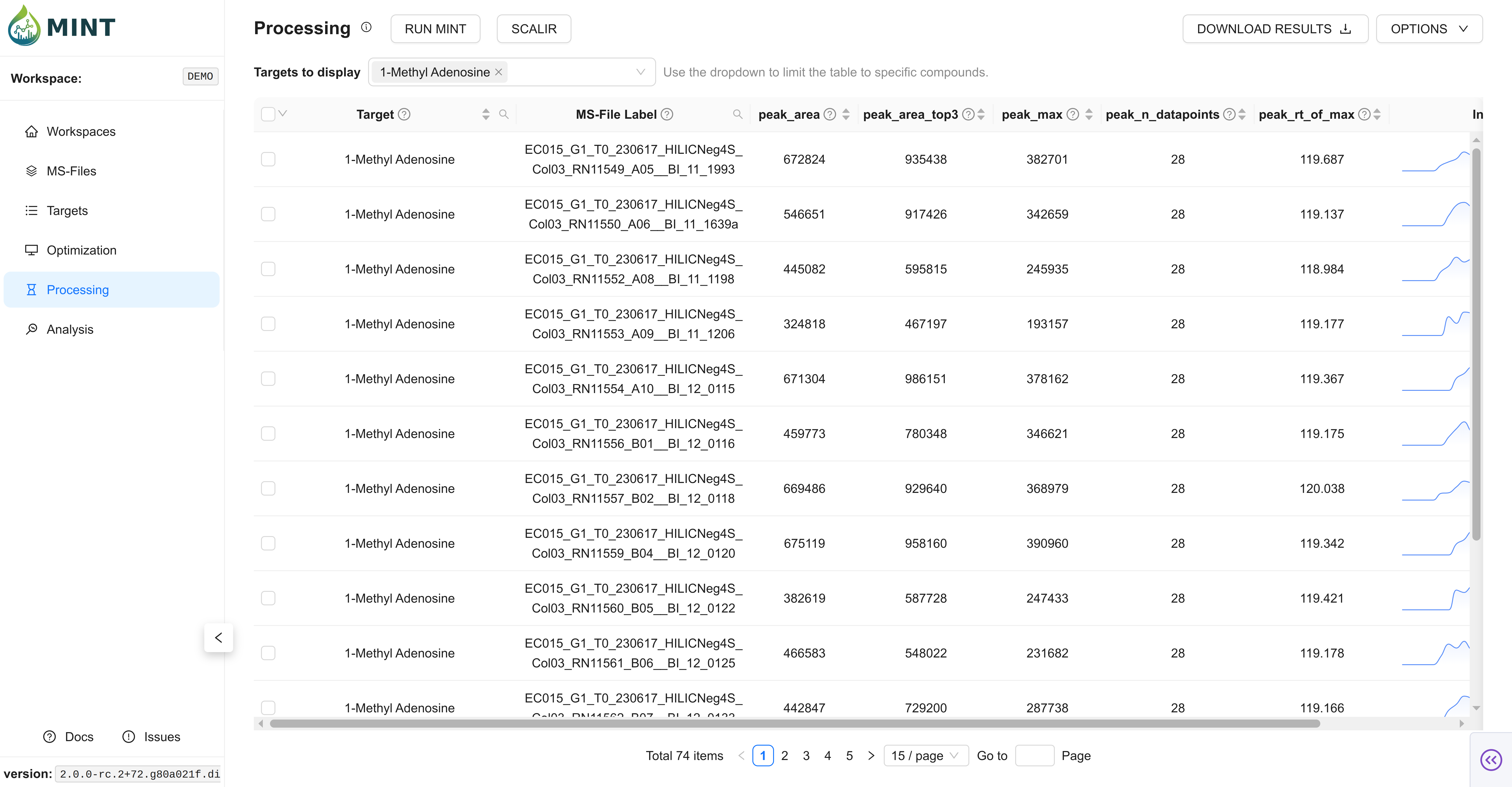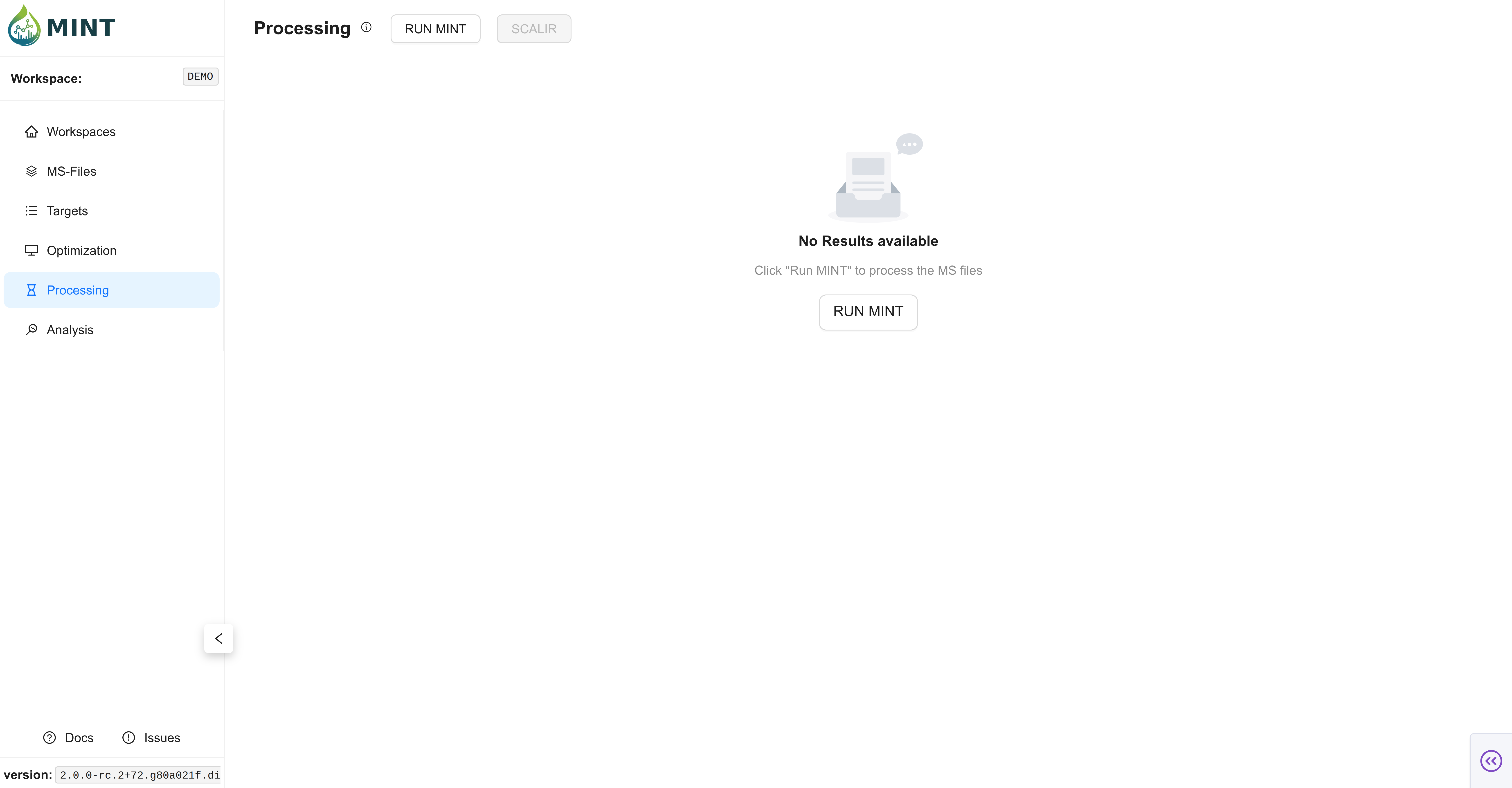 The Processing tab is where MINT performs production extraction for your workspace, generating the final results table used by downstream analysis and exports.
