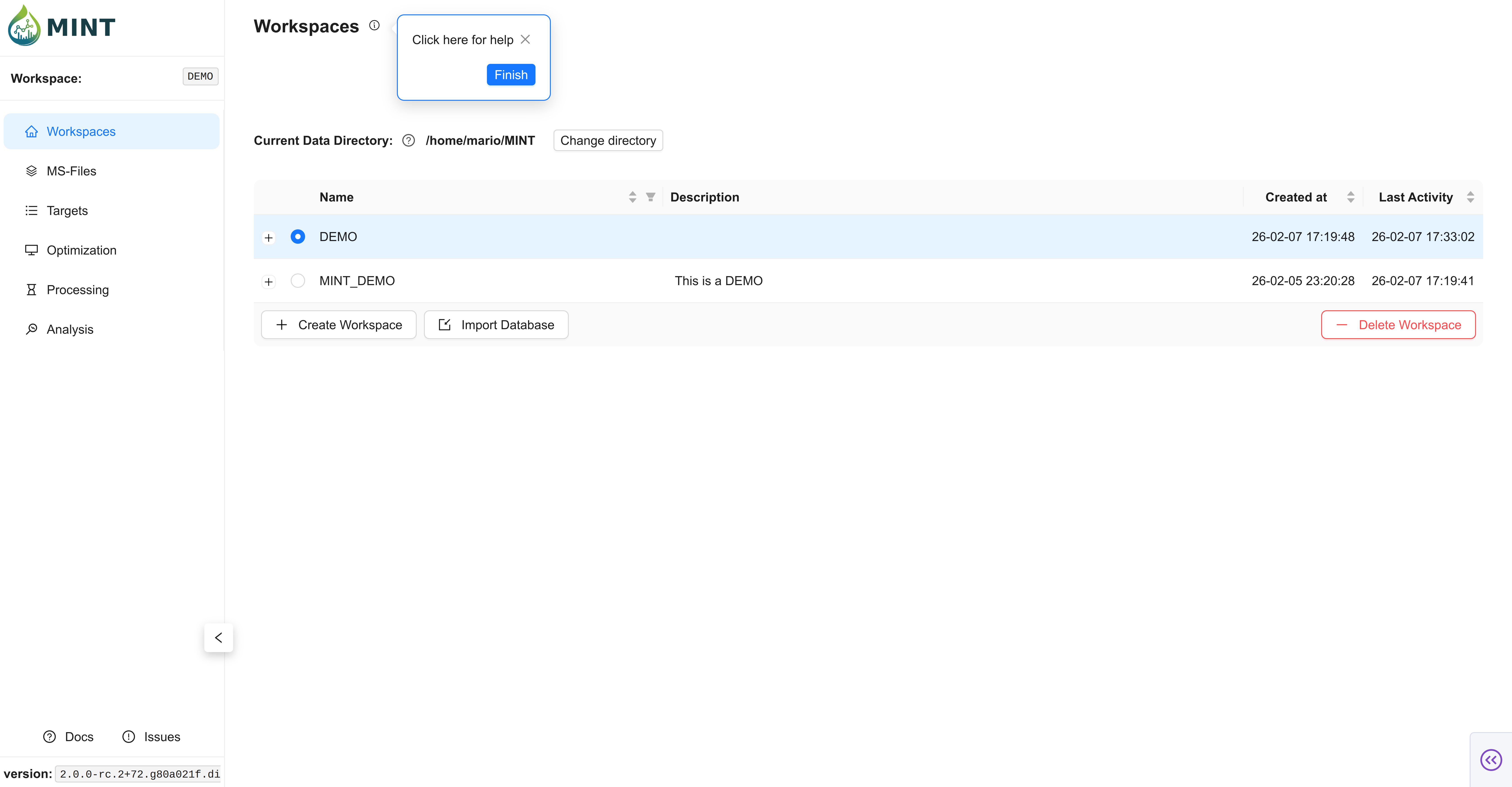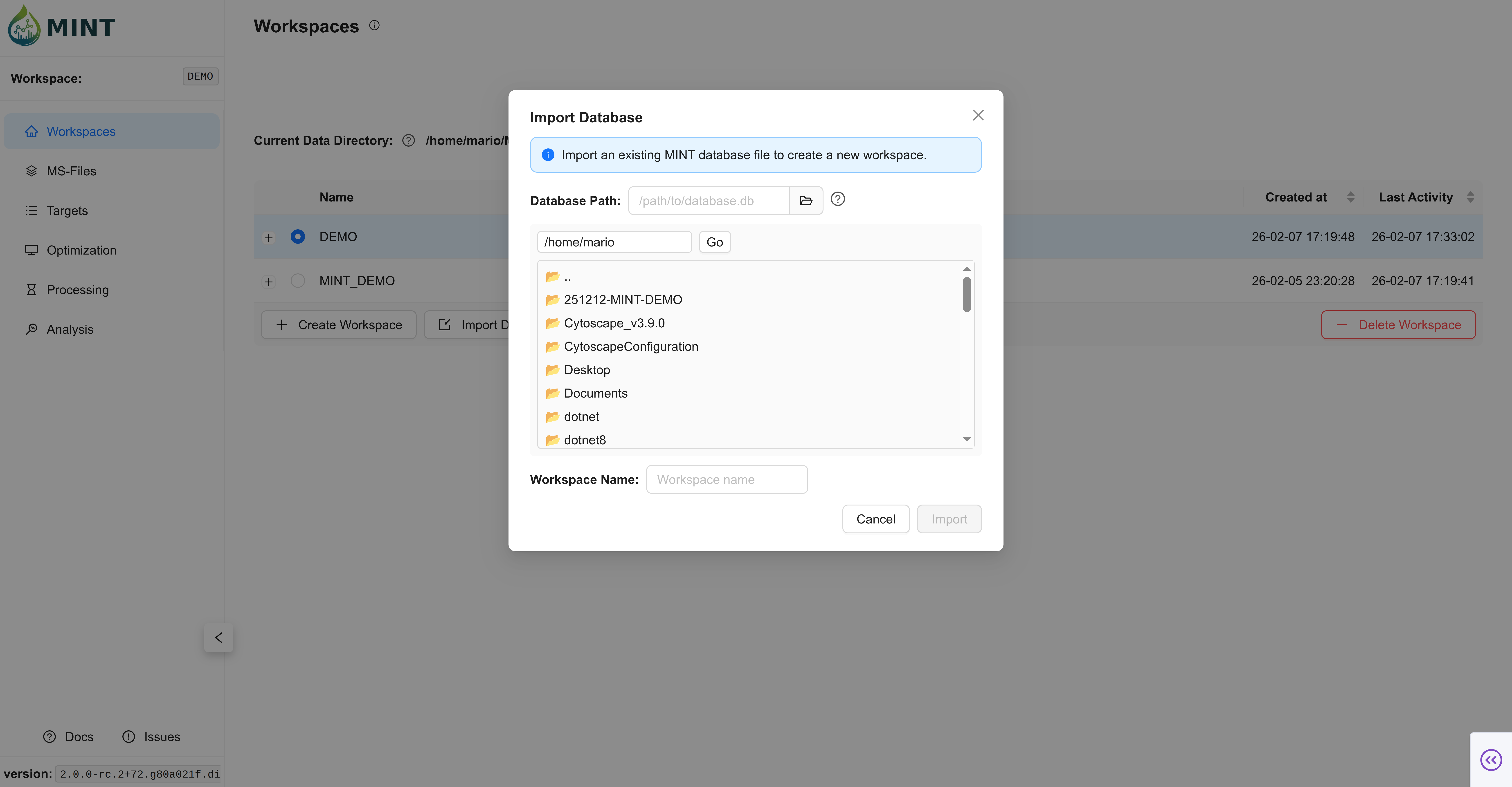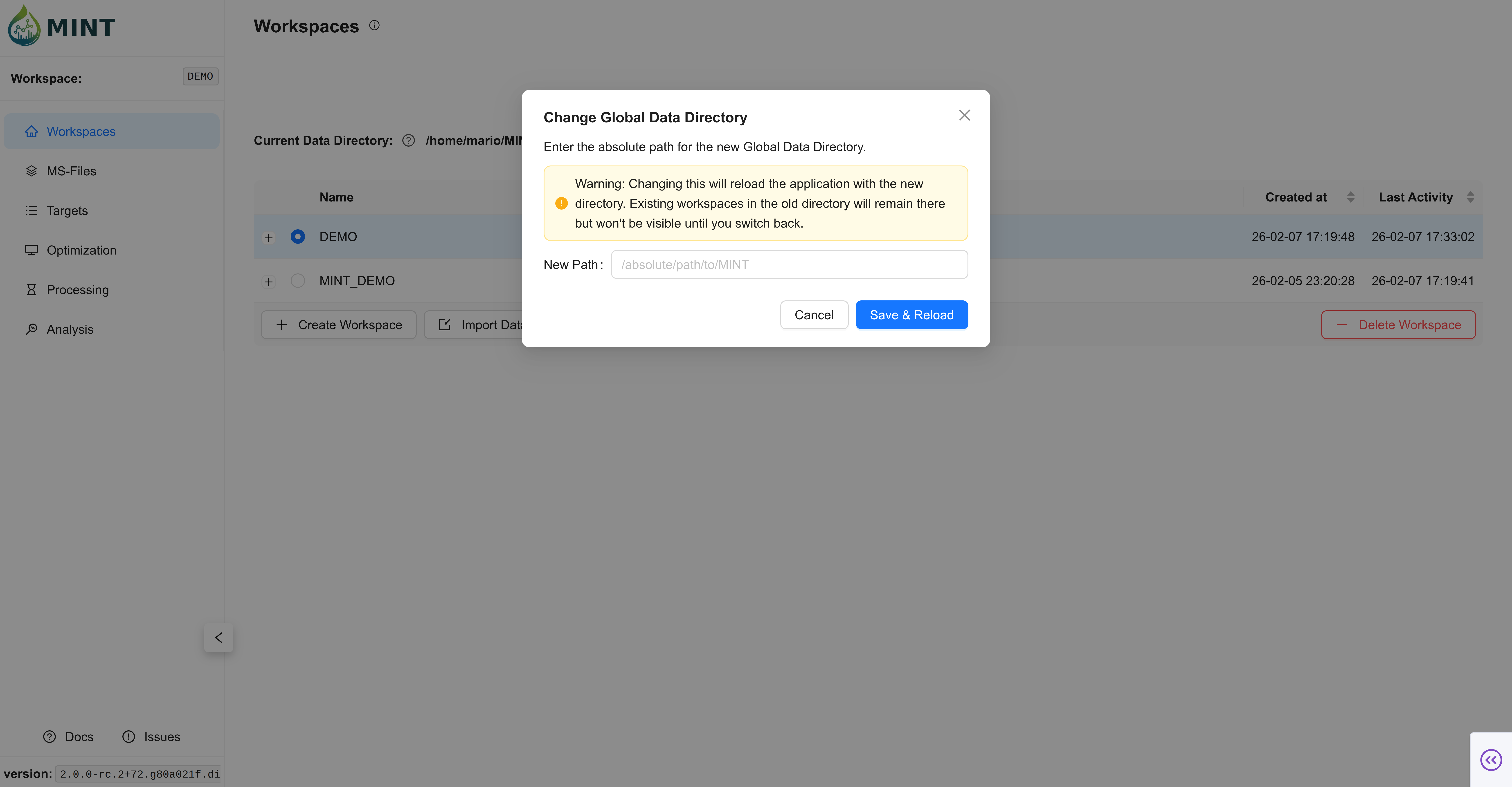 ~/MINT(Linux/macOS) orC:/Users/<username>/MINT(Windows) - Active Workspace: The active workspace is displayed in the sidebar under "Workspace:".