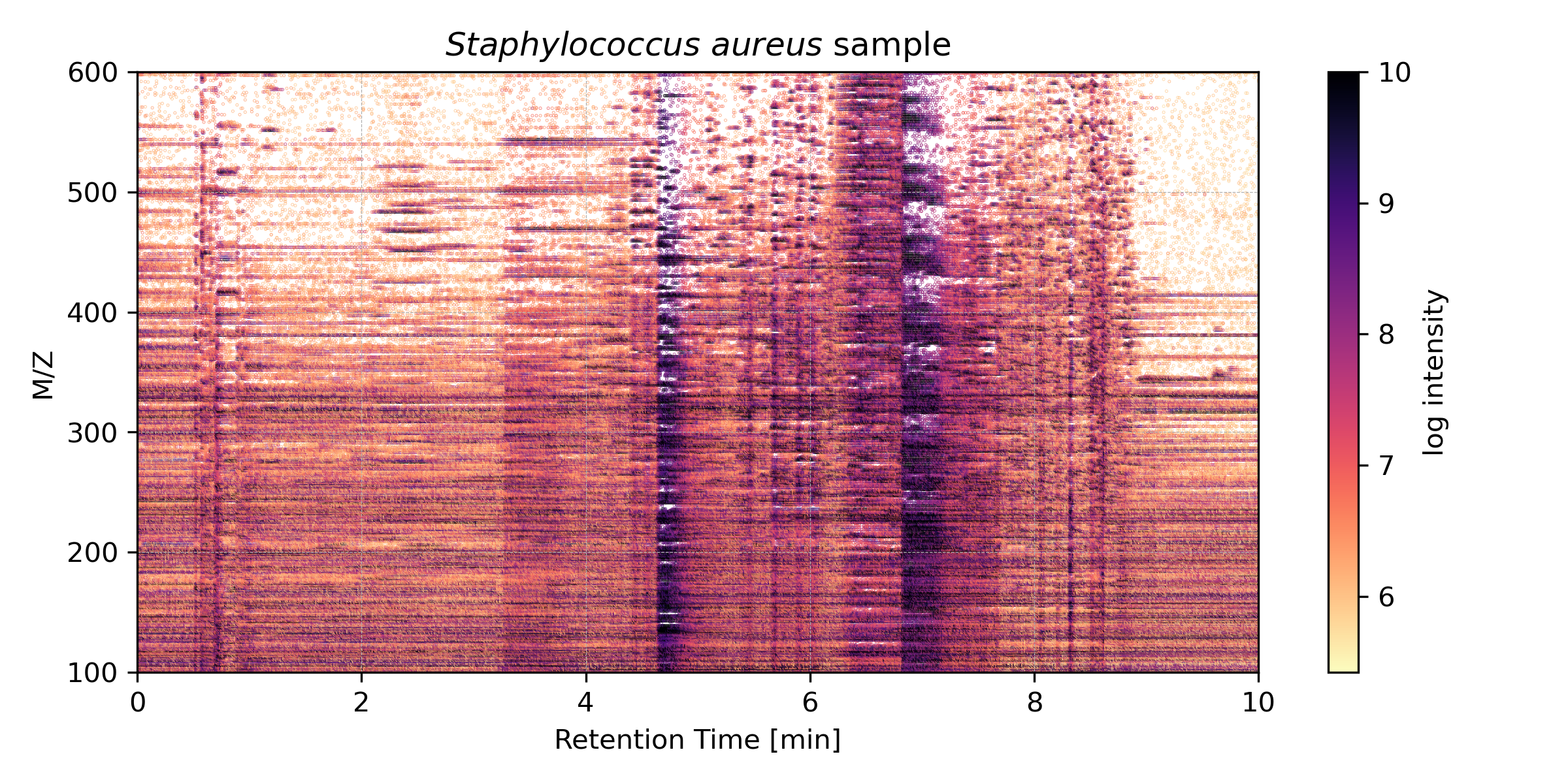 Figure 2: A 2D-histogram of MS1 recorded intensities taken over a time span of 10 minutes. Shown are m/z values between 100 and 600 [Da/z].