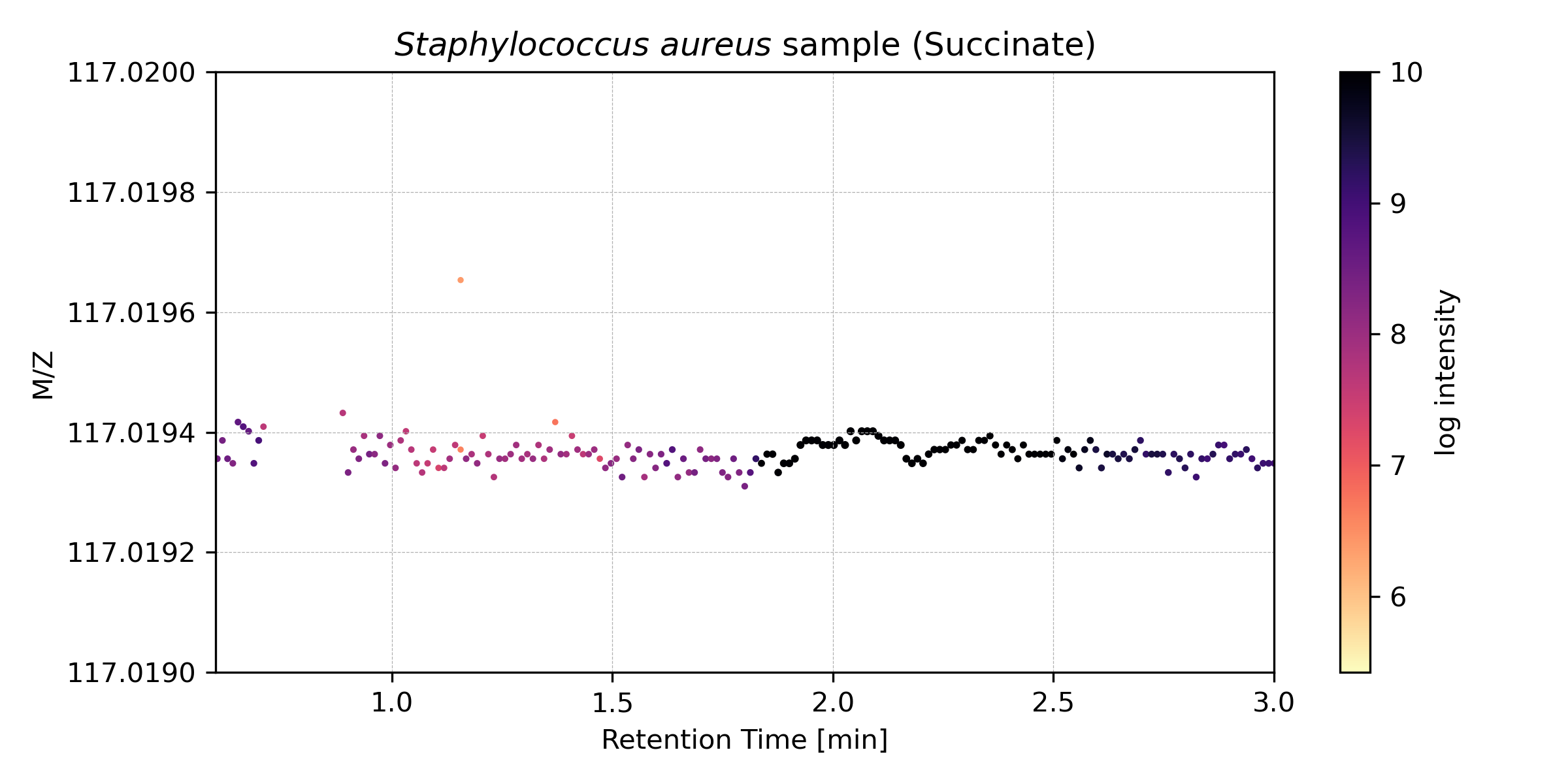 If we zoom into this figure to a very narrow band of masses, the traces of individual metabolites can be observed. The trace of succinate (or succinic acid) is shown here: