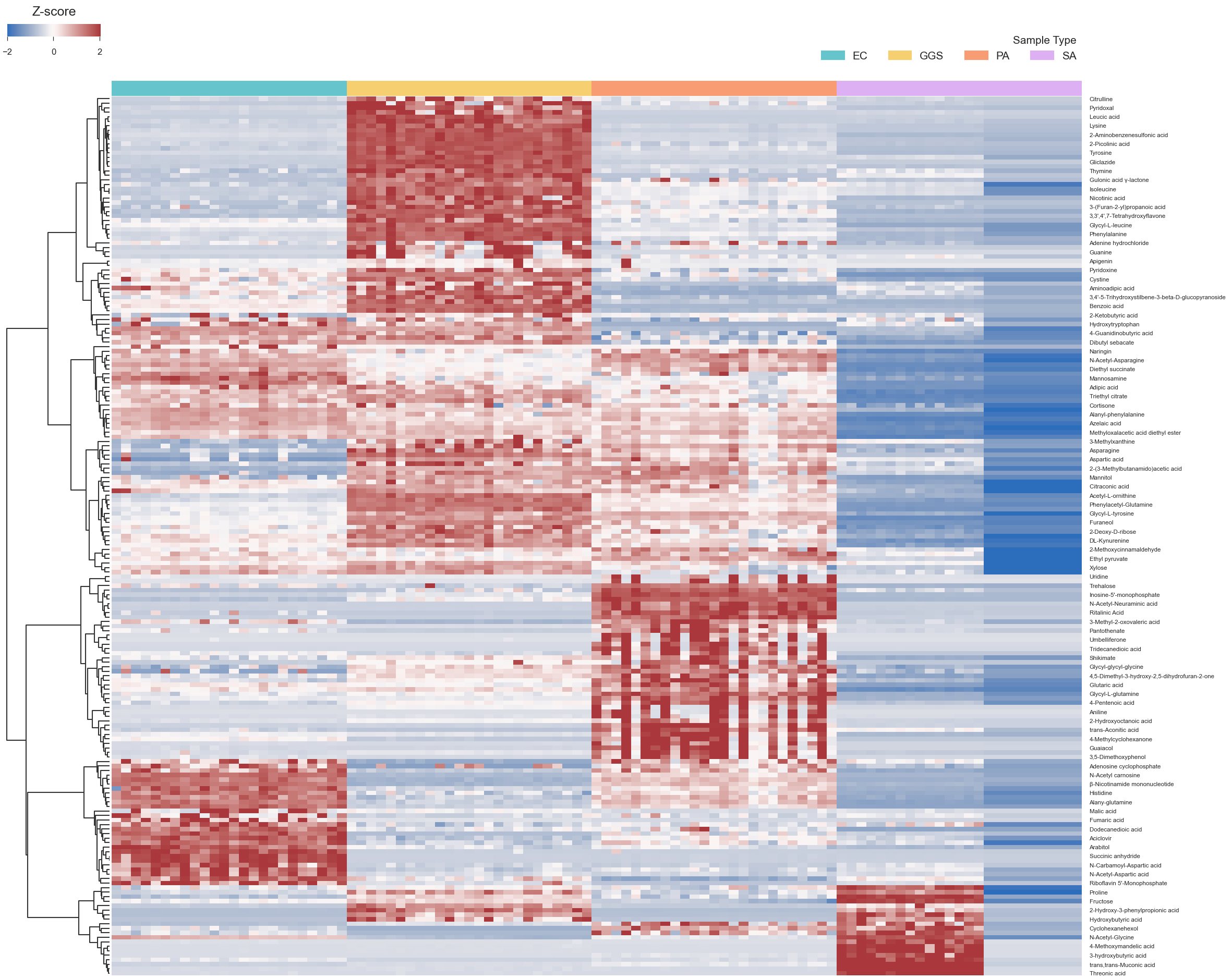 Figure 4: Clustering analysis for a set of metabolites across 100 different samples including 4 different pathogens (EC: E. coli, GGS: S. dysgalactiae, PA: P. aeruginosa, SA: S. aureus).