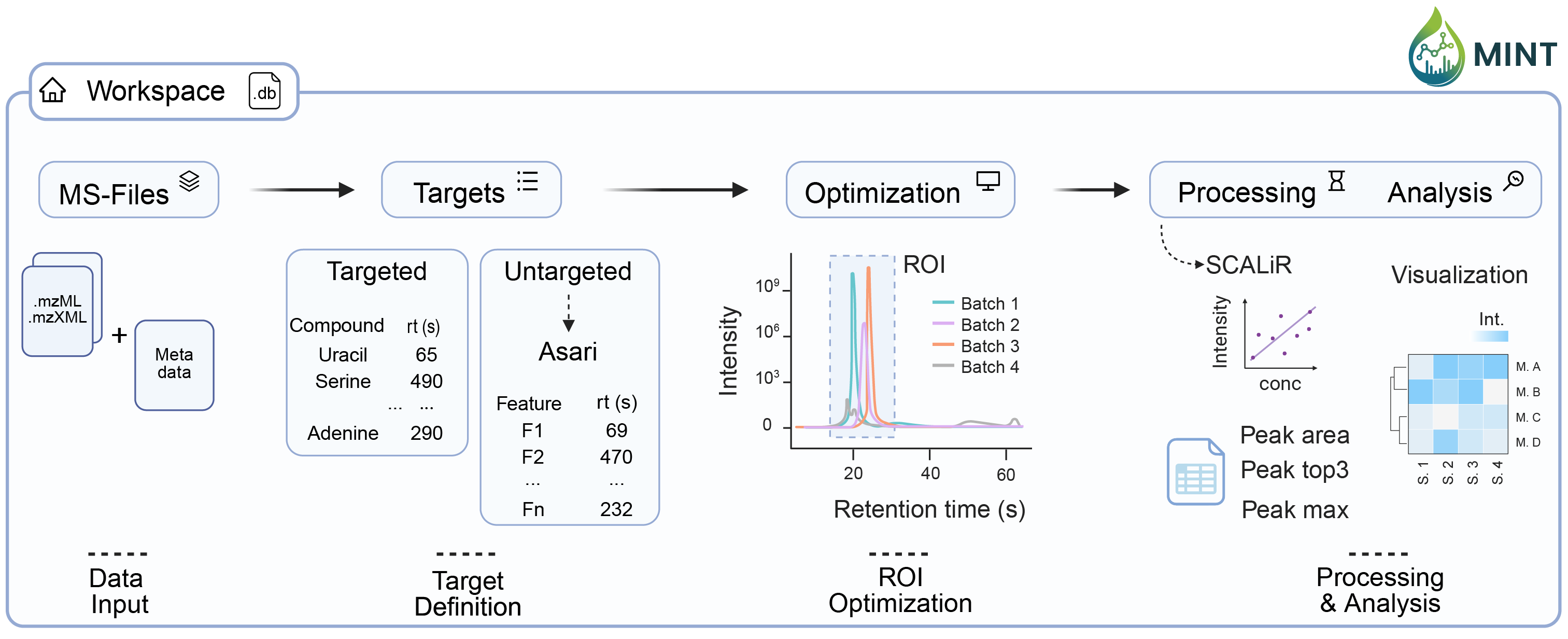 MINT is a post-processing tool designed for liquid chromatography-mass spectrometry (LCMS) based metabolomics analysis. The core philosophy behind MINT is to guide the user through a reproducible metabolomics workflow that involves five main steps: i) data input, ii) target definition, iii) RT region-of-interest optimization, iv) processing, and v) analysis. The entire process is encapsulated within a portable “Workspace” ensuring that experimental data, targets, RT region-of-interest definitions, results, and analyses are kept together for full reproducibility.